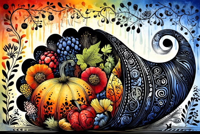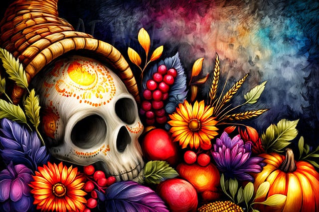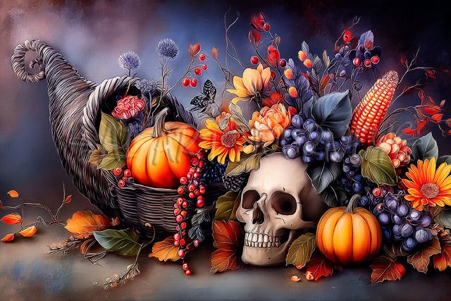 I’m not sure why I’ve been so fixated on creating Thanksgiving cornucopias with goodies — including a human skull — spilling out of them.1 It might’ve been at least partly due to the Facebook friend who, after learning about Midjourney from me, began making all manner of tasteful Thanksgiving images three years ago. Perhaps I felt there was already so much tastefulness in the world that I certainly didn’t need to add any more.