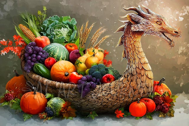 This year I got it into my head that a dragon-shaped cornucopia filled with fruits and vegetables would be a nice touch. Creating one turned out to be so difficult and time-consuming that I decided including a skull was beyond the pale — at least for 2025.2